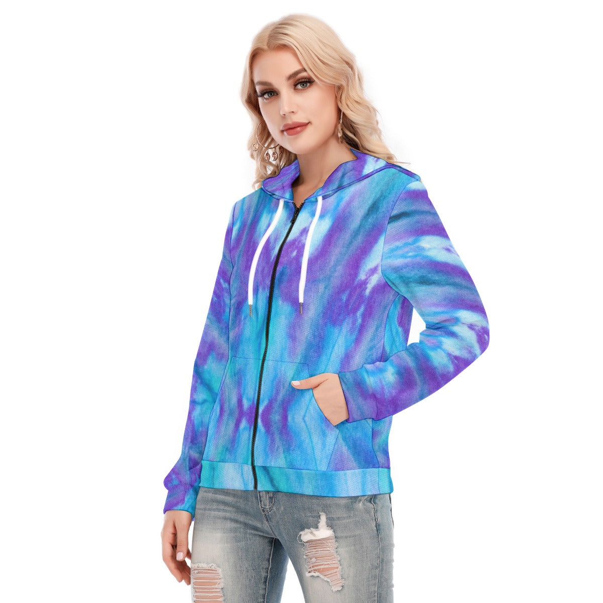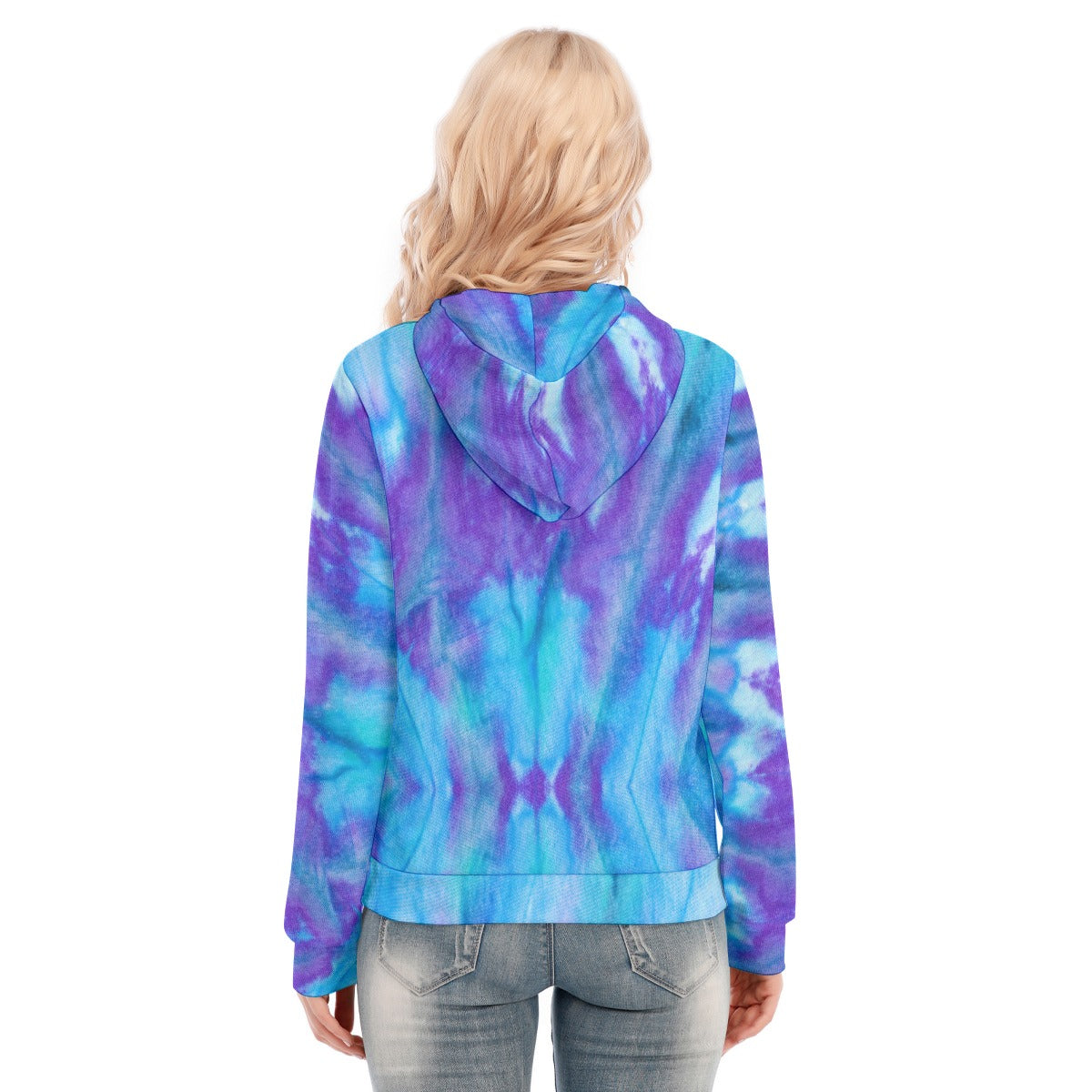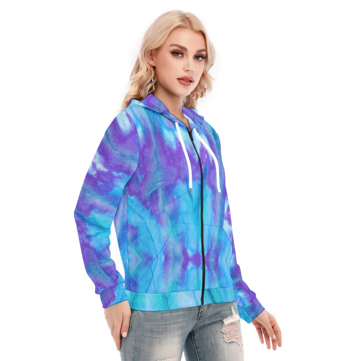 Add some color and comfort to your wardrobe with this women’s blue tie-dye hoodie with zipper. This hoodie features a unique tie-dye pattern in shades of blue, white, and purple, giving it a fun and trendy look. The hoodie has a full-zip front closure, a drawstring hood, and large kangaroo pockets on both sides, making it easy to wear and carry your essentials. The hoodie is made of soft and cozy fabric that will keep you warm and comfortable all day long. Whether you pair it with jeans, leggings, or shorts, this hoodie will make you stand out from the crowd.
