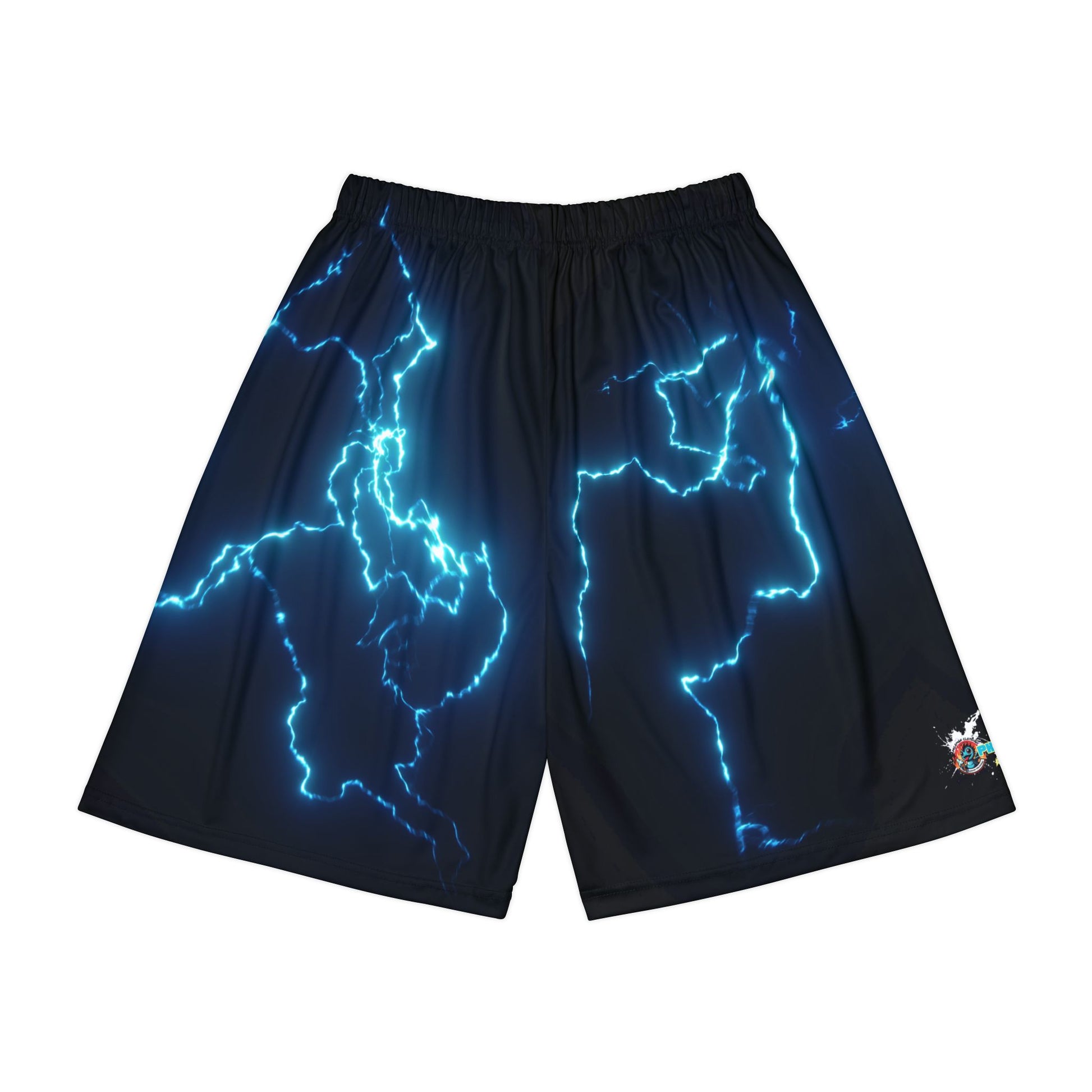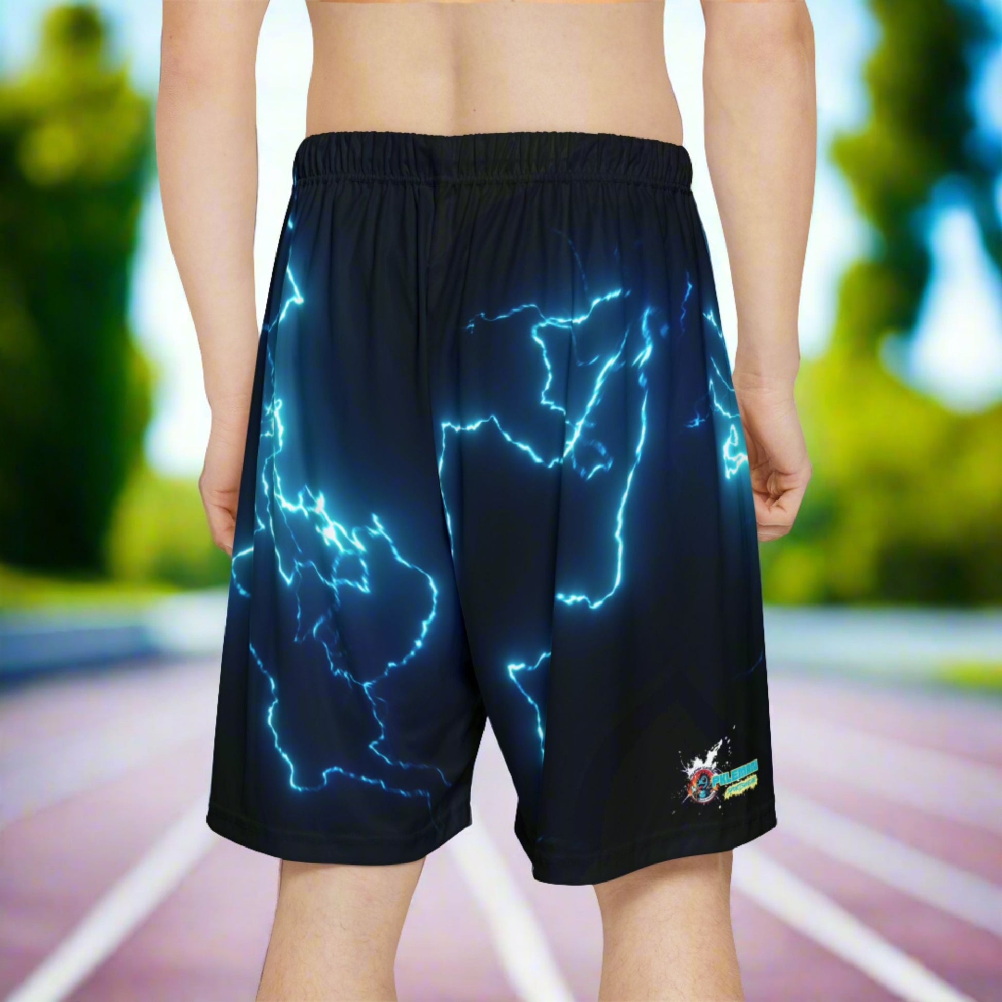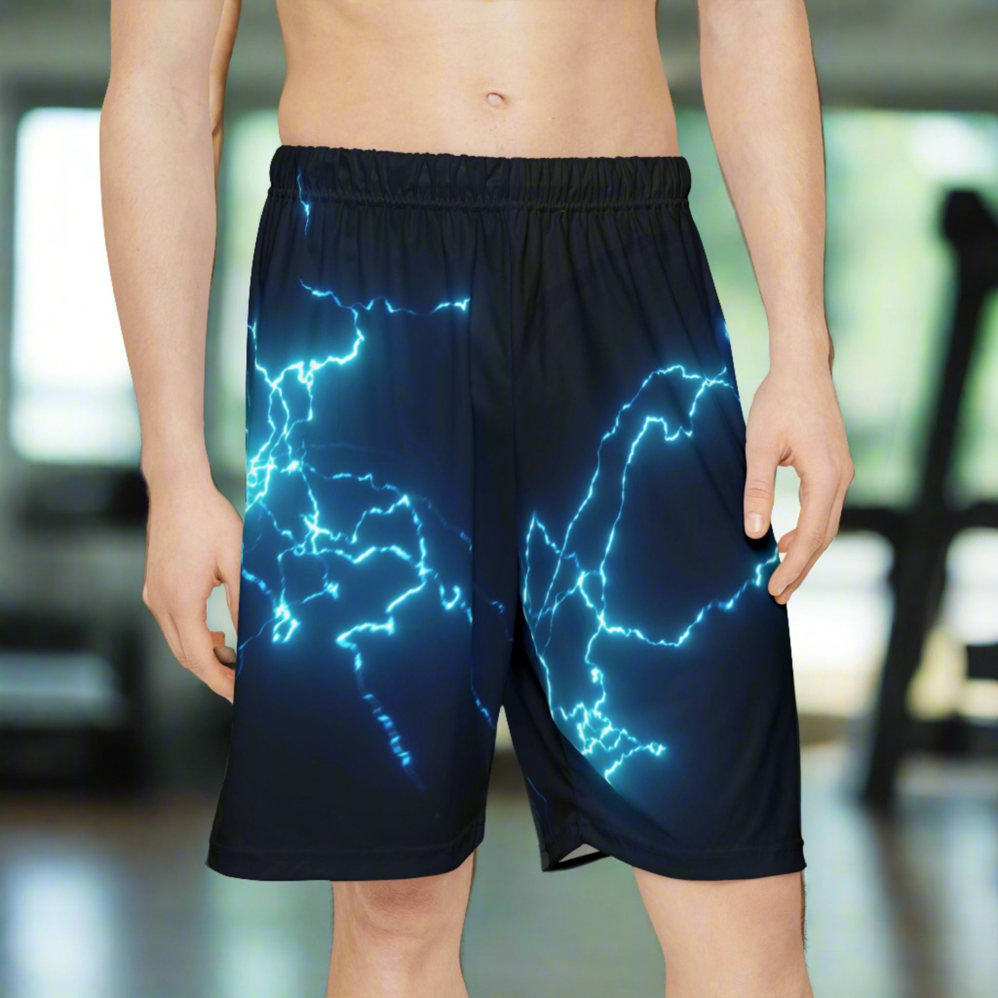 Elevate your performance with our dynamic sport shorts, designed for athletes who demand the best. Crafted from 100% polyester, these shorts feature an ultra-light fabric (4.13 oz/yd²) that ensures maximum comfort and breathability. The sleek white drawstrings offer an adjustable fit, while the seamless design, with thread color matched to the striking electric blue lightning print, adds a touch of sophistication.