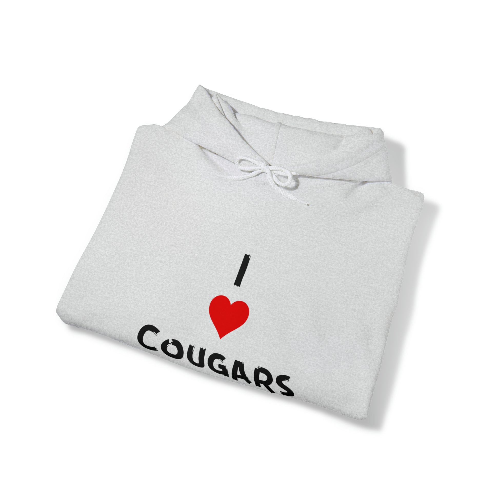 The "I Love Cougars" hoodie is the epitome of chill-out wear. Crafted from a cozy mix of cotton and polyester, this sweatshirt is like a warm hug on a chilly day. It boasts a roomy kangaroo pocket up front for all your bits and bobs, and the drawstring on the hood matches the sweater, because who doesn't love a bit of matchy-matchy?