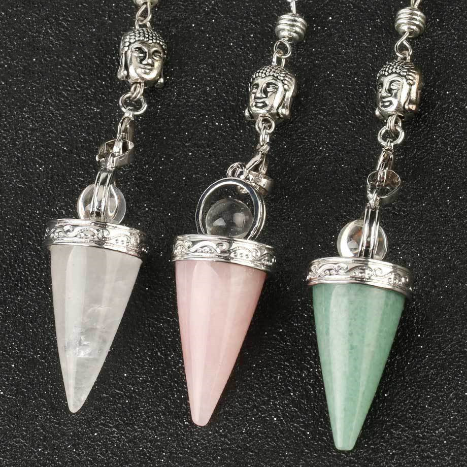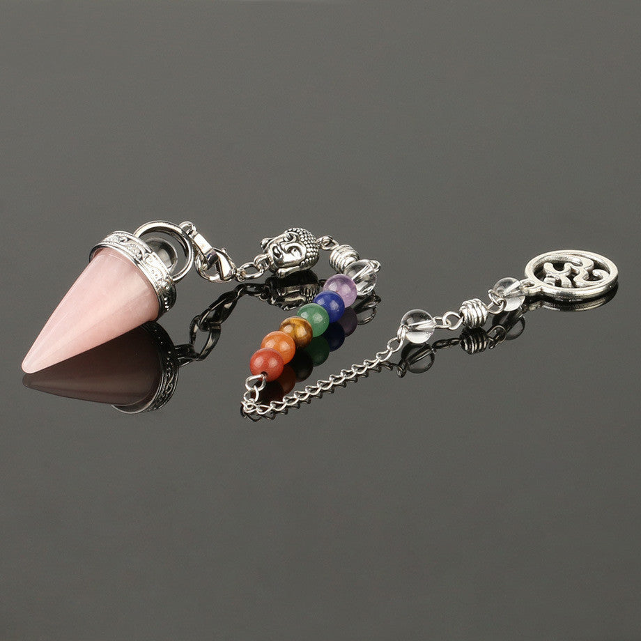 - Boasts a sleek and modern titanium steel chain with cone-shaped gemstone pendants