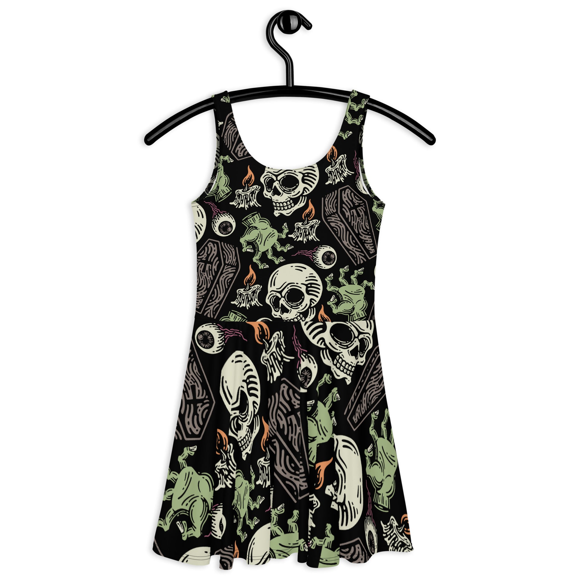Crafted from a blend of 82% polyester and 18% spandex, this dress offers a smooth and elastic fabric that adapts to any occasion. The mid-thigh length flared skirt adds a playful swing to your step, perfect for both casual outings and dressier events. The elastic waistline ensures a comfortable and flattering fit, making it easy to transition from day to night. Designed with overlock seams and a coverstitch hemline, this sleeveless dress is as durable as it is stylish. The bold skull and eyeball pattern against a black background makes it a standout piece, whether you’re dressing it up with heels or keeping it casual with sneakers. Versatile and edgy, this dress is your go-to for any occasion.