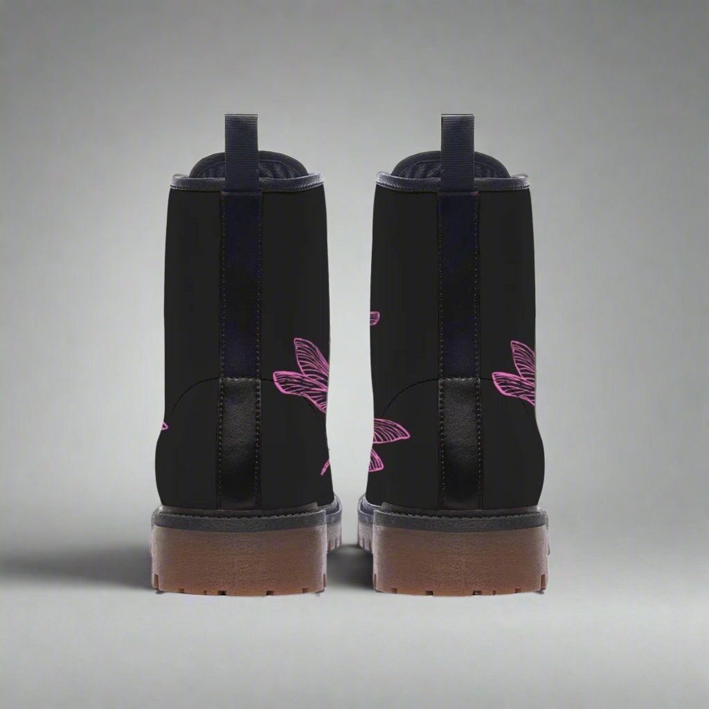 - Design: Featuring a vibrant pink dragonfly motif on a classic black boot, these boots are sure to turn heads. The rear pull-loop makes them easy to slip on and off.
